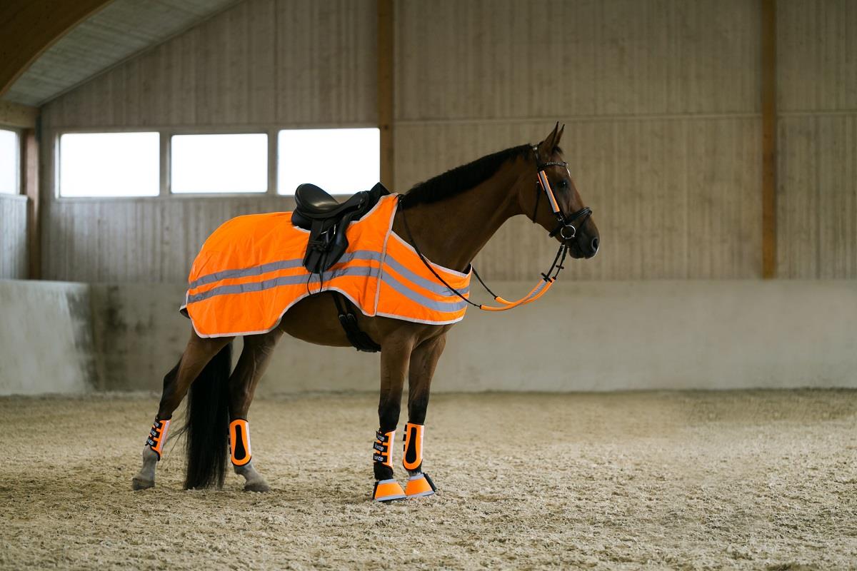 Ausreitdecke mit großflächigem, rundum laufenden Reflektorstreifen für perfekte Sichtbarkeit in der Dunkelheit. Mit Brustsatz. Passt perfekt zu den bZeen Hufglocken.