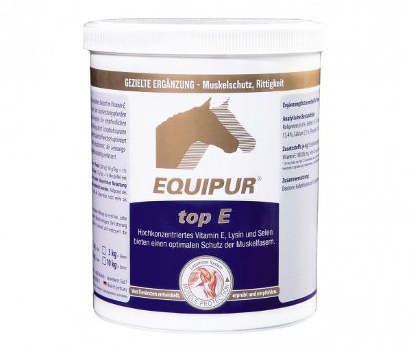 EQUIPUR - top E deckt den erhöhten Bedarf an Vitamin E, Selen und Lysin bei Sport- und Hochleistungspferden ausreichend ab. Dadurch werden die empfindlichen Muskelfasern vor der Zerstörung durch Schadsubstanzen effektiv geschützt sowie der Muskelstoffwechsel optimiert und somit die körperliche Belastbarkeit, Leistungsbereitschaft und Rittigkeit nachhaltig verbessert.
