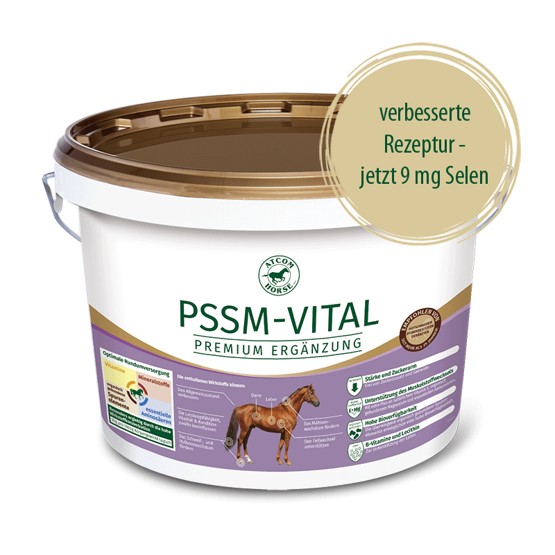 ATCOM PSSM-VITAL versorgt das pssm- und stoffwechselempfindliche Pferd, sowie Pferde mit einem hohen Muskeltonus mit lebenswichtigen Vitaminen, Mineralstoffen, Spurenelementen und Aminosäuren. Deswegen ist das ATCOM PSSM-VITAL gezielt ohne Aromastoffe, Getreide- und Zuckerzusätzen konzipiert.