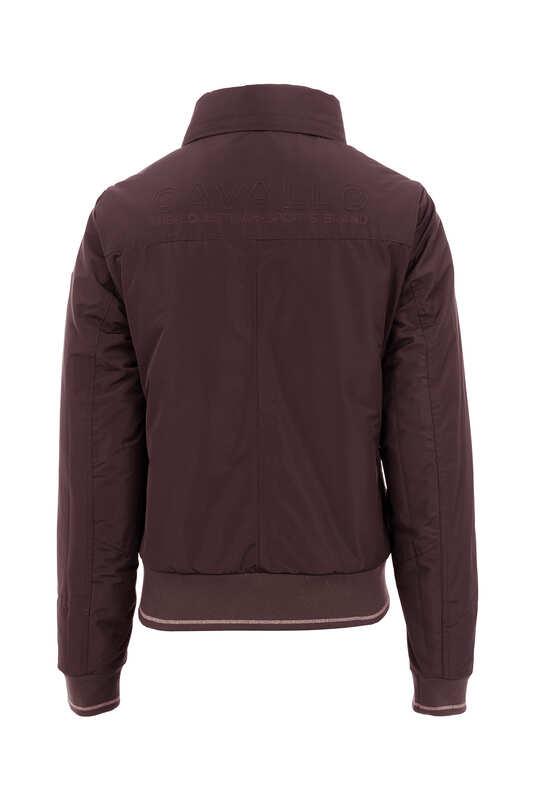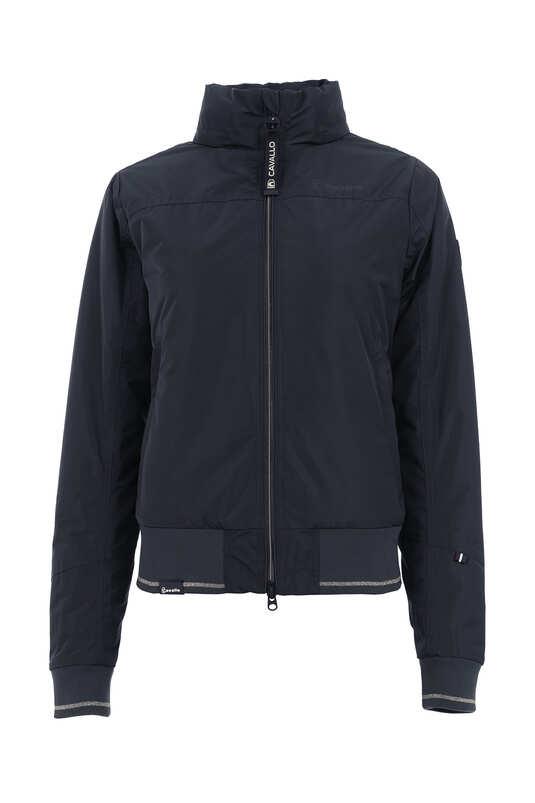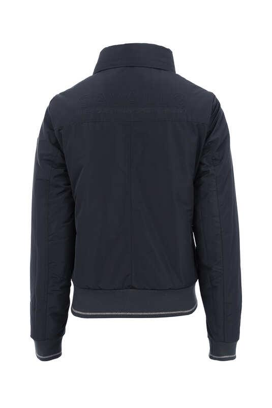Mit leichter Wattierung. Strickbündchen an Ärmel und Bund mit Kontraststreifen. Praktische Kapuze im Kragen integriert. Zwei vordere Eingrifftaschen mit Reißverschlüssen. Eine Brustinnentasche mit Reißverschluss. 2-Wege Reißverschluss in vorderer Mitte mit Cavallo Webbandanhänger. Reflektierende Details, z.B. Cavallo Logo auf der linken Brust und aufwendiges, reflektierendes Cavallo Logo auf der hinteren Passe.