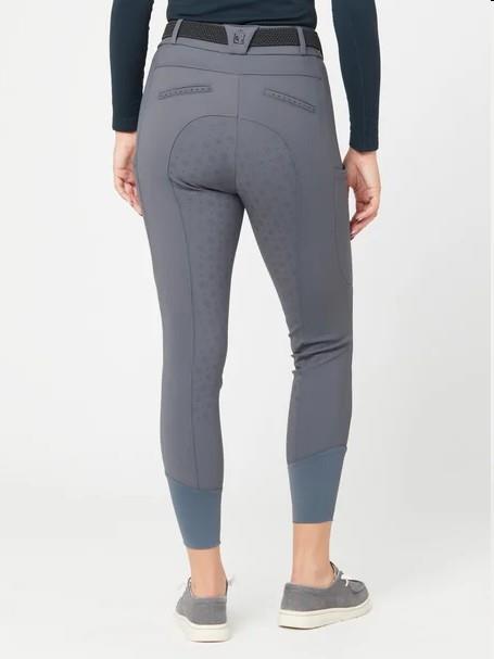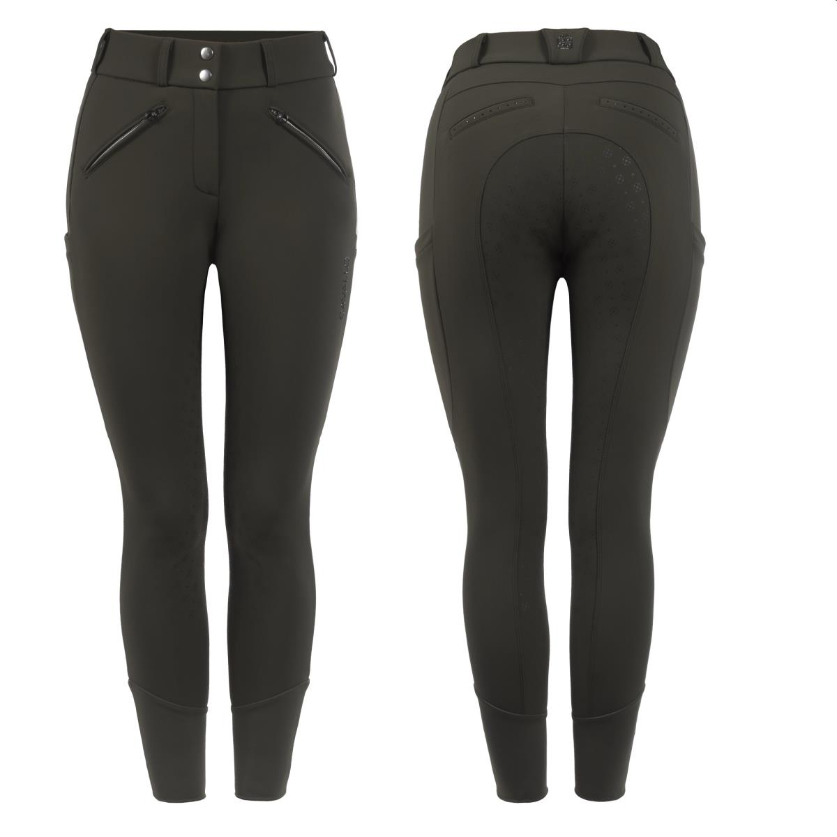 Schwarze Artworks aus Kristallen auf dem linken Oberschenkel und der hinteren Gürtelschlaufe unterstreichen die Eleganz der Reithose.